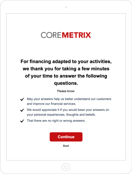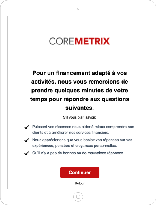 Standard landing pages provide an effective way to provide users with supplementary instructions before commencing the Coremetrix quiz. The content on the standard landing page is entirely customizable, allowing you to include headers, paragraphs, and lists tailored to your needs. Furthermore, you have the flexibility to personalize both the logo and button text to align with your branding and preferences.